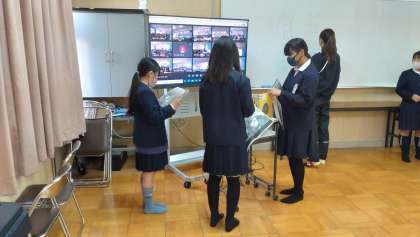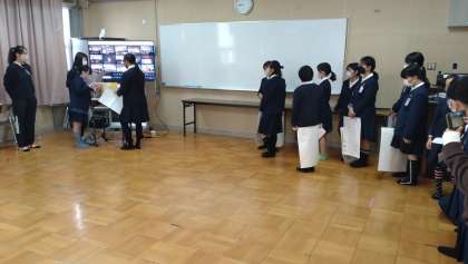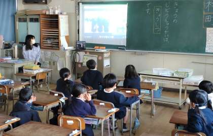 朝の時間に児童集会がありました。今日は、図書委員会の子どもたちが、リモートでの本の読み聞かせやクイズなどの発表をしました。写真は、図書委員会の子どもたちの発表の様子と、それをしっかりと見ている1年生の様子です。