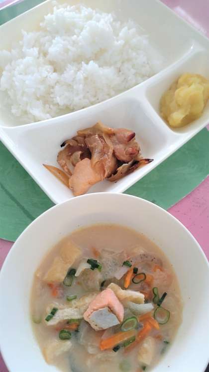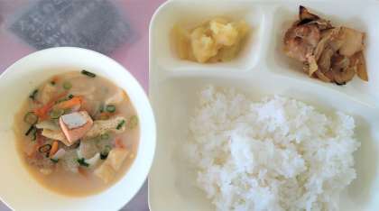 今日の給食は、鶏肉の甘辛焼き、かす汁、くりきんとん、ごはん、牛乳です。