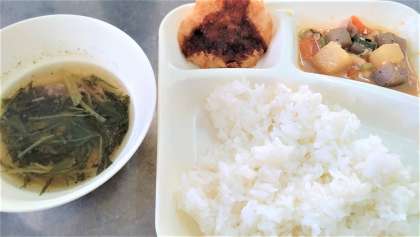 今日の給食は、学校給食献立コンクールの最優秀作品で、鶏肉の土手焼き風、はりはり汁、れんこんのフライ大阪ソース味、ごはん、牛乳です。
