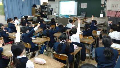 朝、児童集会がありました。友だちの国を知ろう週間ということで、集会委員会や外国にルーツをもつ子どもたちからのクイズや外国の紹介などのビデオ発表でした。写真は、発表を見て、クイズに元気に答えている3年生の様子です。