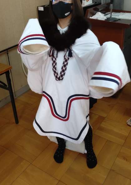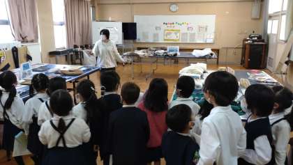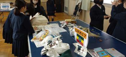 多目的室に、イヌイットやエチオピアなどの民族の服や楽器、生活用品などの展示をしています。子どもたちは、民族衣装を着たり、生活の道具をさわったりして、地域の特色を生かした暮らしの様子を実感していました。写真は、1年生、5年生が見学している様子です。