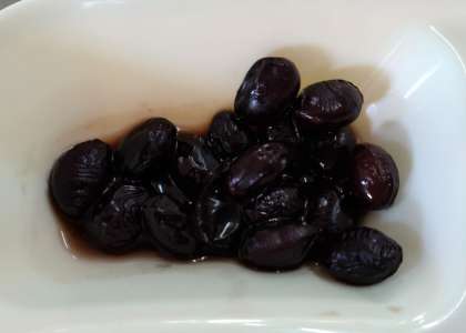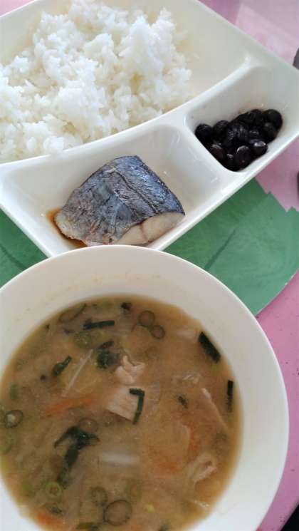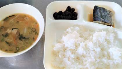 今日の給食は、さごしのしょうゆだれかけ、みそ汁、黒豆の煮もの、ごはん、牛乳です。