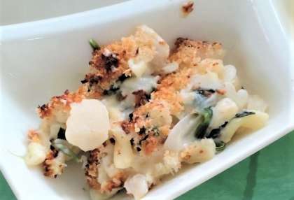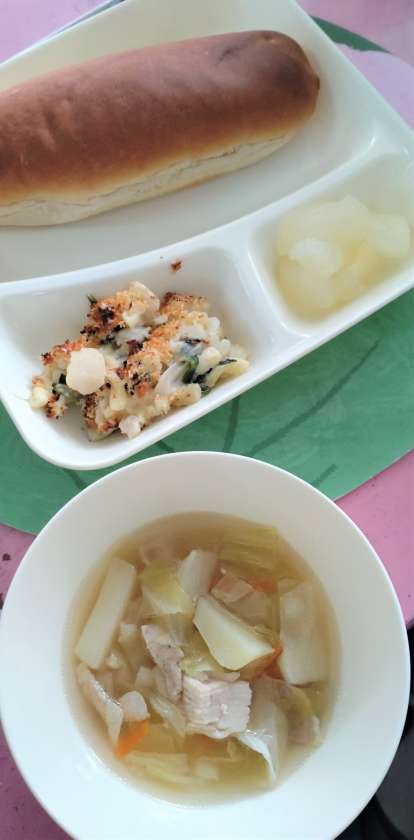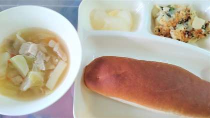 今日の給食は、ほたて貝のグラタン、スープ、和なし(カット缶)、黒糖パン、牛乳です。