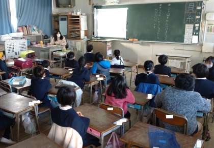 今週の火曜日より、全国学校給食週間が始まっています。今朝の児童集会でも、給食委員会の子どもたちによるビデオ発表がありました。学校給食の歴史や食材のクイズなど、工夫を凝らした発表でした。写真は、給食委員会のクイズに参加したり、発表を見たりしている1年生の子どもたちの様子です。