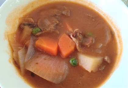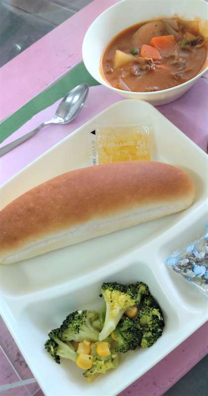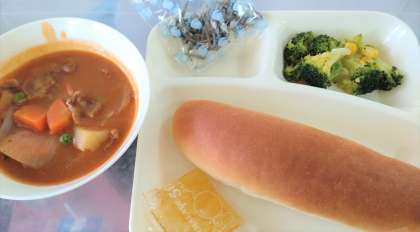 今日の給食は、ビーフシチュー、ブロッコリーとコーンのサラダ、ミニフィッシュ、コッペパン、マーマレード、牛乳です。