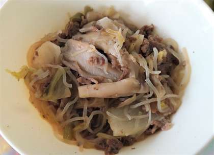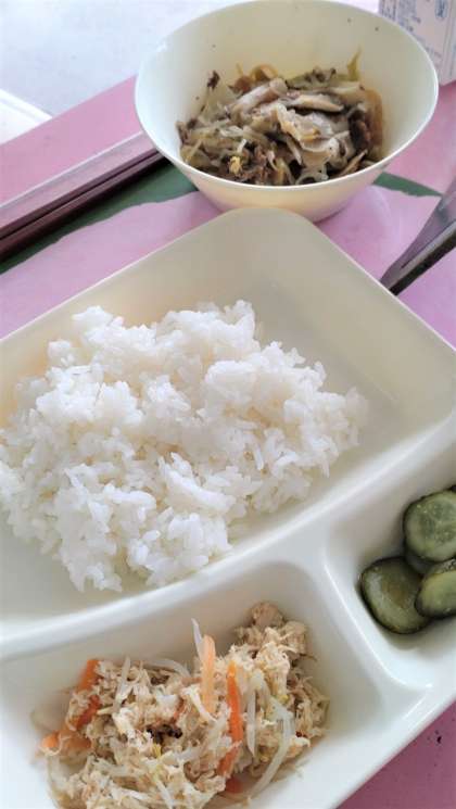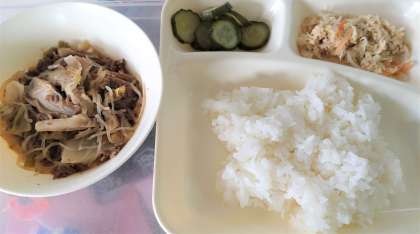 今日の給食は、すき焼き煮、もやしとささみのいためもの、きゅうりのゆず風味、ごはん、牛乳です。