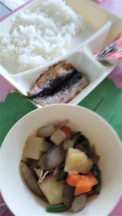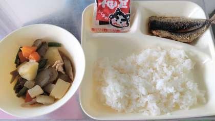 今日の給食は、いわしのしょうがじょうゆかけ、含め煮、いり大豆、ごはん、牛乳です。