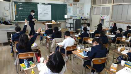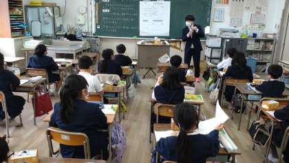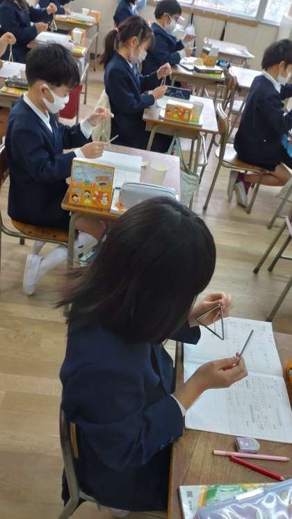 3年生で理科の公開授業がありました。音の出ているときのようすがどうなっているか、トライアングルで実験しました。子どもたちは、予想をたてて実験に取り組みました。