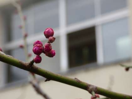 正門を入った左手に桜の木があります。その木の隣に梅(紅梅)の木があります。枝先には小さな蕾(つぼみ)がたくさんついています。もう一月ほどで咲くかもしれません。