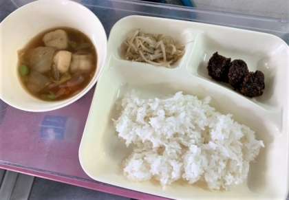 今日の給食は、くじらのオーロラ煮、まる天と野菜のうま煮、もやしのピリ辛あえ、ごはん、牛乳です。