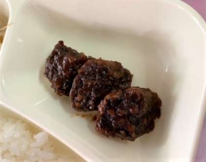 今日の給食の「くじらのオーロラ煮」は、油であげたくじらに、ケチャップや赤みそなどで作ったたれをからのせています。