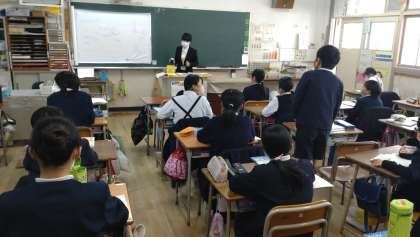 5年生で公開授業がありました。「単位量あたりの大きさの考え方を使って、速さをくらべよう」という学習でした。子どもたちは、発表もとても積極的で、ペアでの話し合いも活発でした。
