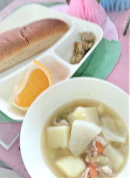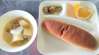 今日の給食は、鶏肉のカレー風味焼き、洋風煮、はっさく、黒糖パン、牛乳です。