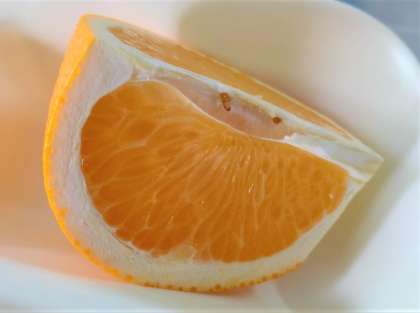 はっさくは、広島県で生まれた果物です。薄皮の袋を開いてね果肉の部分を食べましょう。