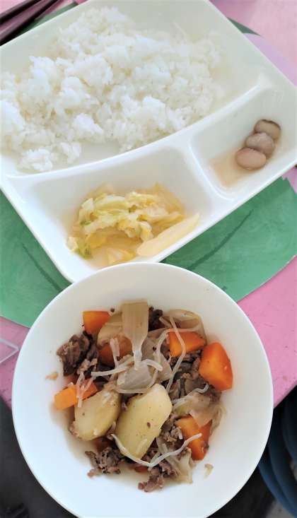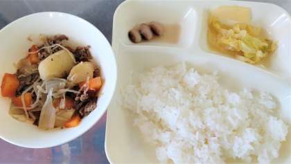 今日の給食は、肉じゃが、はくさいのゆず風味、とら豆の煮もの、ごはん、牛乳です。