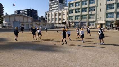 3月に入り下校時間が午後4時30分になりました。放課後の運動場では、たくさんの子どもたちが元気よく遊んでいました。バスケットボールやサッカー、短なわなど、遊びも様々です。