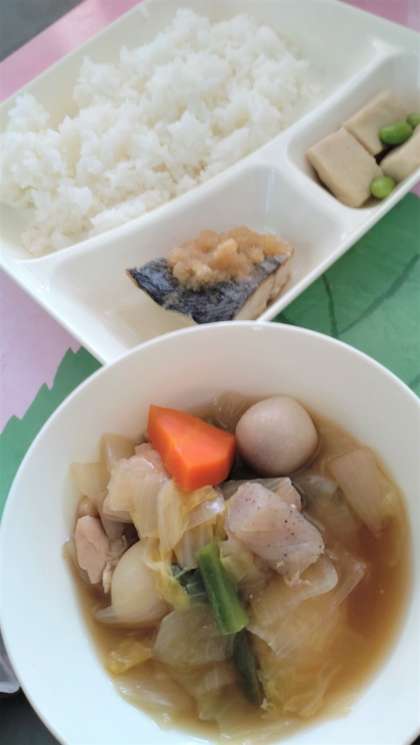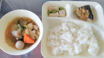 今日の給食は、さごしのおろしじょうゆかけ、さといもと野菜の含め煮、高野どうふの煮もの、ごはん、牛乳です。