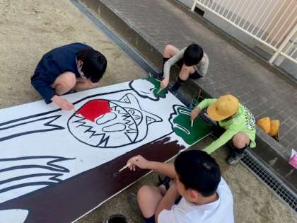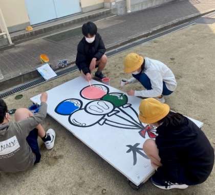 写真は、運動委員会の子どもたちが縄跳びの練習台(跳び板・ジャンピングボード)に熱心に描画している様子です。