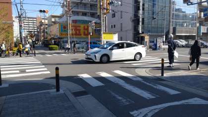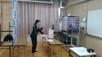 写真は、上段から地域の見守り隊と淀川警察の方々の見守りの様子、中段は、淀川警察の交通安全指導、下段は、児童の1学期の目標の発表の様子です。