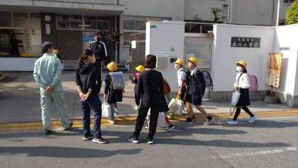 4月11日(火)、本日、新学期2日目で、1年生を迎える会、給食開始、区役所セーフティ淀川(1年生)、発育測定6年生があります。写真上段は、正門での子どもたちの様子と下段は、道路や踏切などの危険箇所を示した交通安全マップです。子どもたちには、車や電車に気をつけて1年間安全に登校してほしいと思っています。