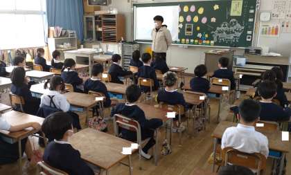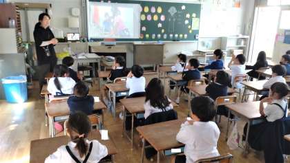 1年生にとって今日ははじめての給食です。給食の時間の前に、手洗いの動画を見て、給食を食べる前や休み時間の後に学校生活でする手洗いの大切さについて学んでいます。