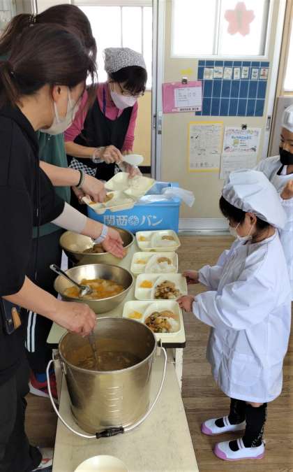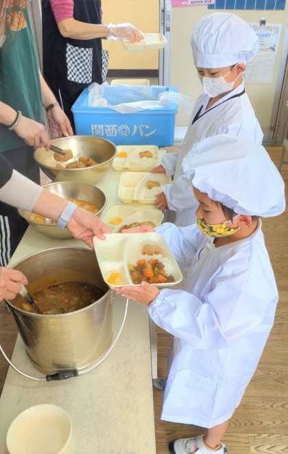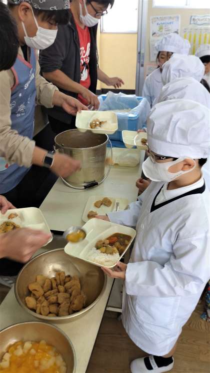 6年生にお手伝いしてもらって給食の配膳の用意ができました。順番に、今日の給食のカツカレーライスを取りに来ています。写真は、配膳の様子です。