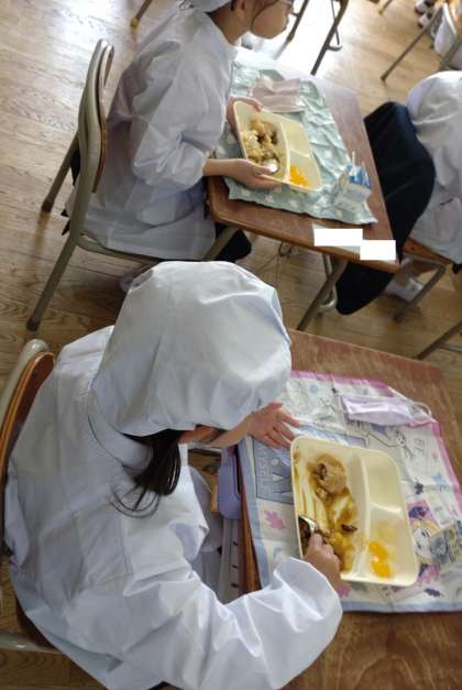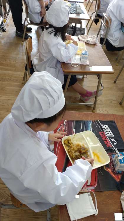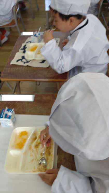 給食をおいしくいただいています。おかわりする子もいました。