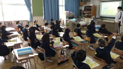 1年生が算数の学習に取り組みました。これから学ぶ算数に対して、興味や関心,期待をもてるように学習しています。同じものをぜんぶまとめてかこみ、ものの集まりに着目する学習内容です。