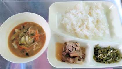今日の給食は、豚肉のしょうが焼き、みそ汁、じゃこピーマン、ごはん、牛乳です。