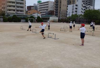 5年生がハードル走に取り組んでいます。自分に合ったインターバルのコースで、グルーブで協力しながら、ハードルを走り越えることの楽しさや心地よさを味わえるように運動しています。