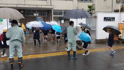 4月26(水)、本日は、朝の英語モジュール、視力検査1年生、尿検査、委員会活動・代表委員会があります。今朝も雨の日ですが、地域の見守り隊の皆様の見守りの中、子どもたちは元気に登校しています。写真は、正門で教職員の見守りの中で登校する子どもたちの様子です。しっかりと挨拶・会釈もできています。