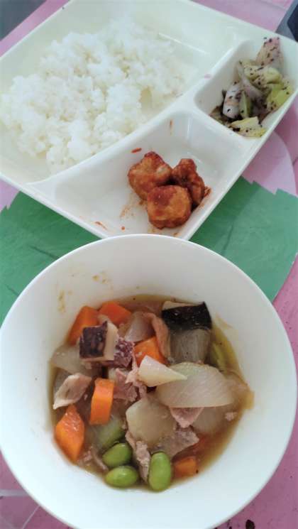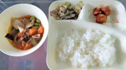 今日の給食は、まぐろのオーロラ煮、豚肉と野菜の煮もの、キャベツの赤じそあえ、ごはん、牛乳です。