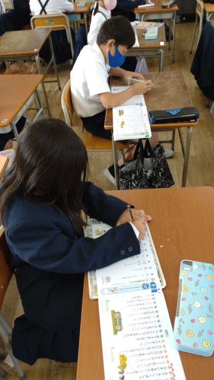 3年生が漢字の学習に取り組んでいます。写真は、漢字ドリルで熱心に漢字の練習をしている子どもたちの様子です。とても集中しています。