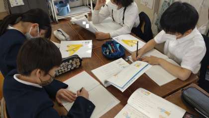 5年生が国語科で、物語文「だいじょうぶ だいじょうぶ」の学習をしています。グループで、人物像や物語の全体像を具体的に想像できるように、段落ごとの内容について話し合っています。