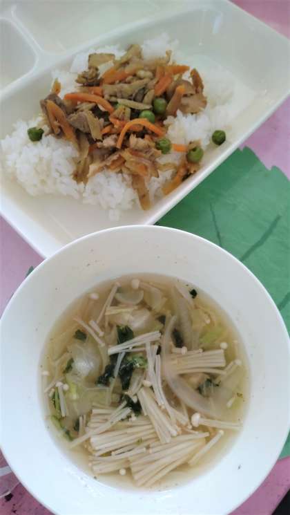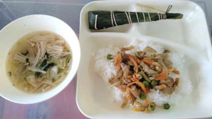 今日の給食は、「子どもの日の行事献立」で、きんぴらちらし、すまし汁、ちまき、牛乳です。