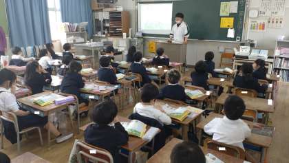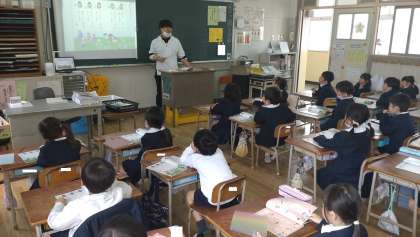 1年生の国語で、語のまとまりや口形に気をつけて音読する学習に取り組んでいます。これまでの学習や経験を生かしながら、進んで、姿勢や口形、発声や発音に注意して声を出し、楽しんで音読することが学習の目標です。