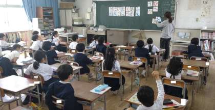 1年生のこの授業では、音節と文字との関係に気づき、「あ」「い」「う」「え」「お」の付く言葉を身の回りから集める学習に取り組んでいます。生活の中で見つけた物の中から,「あ」「い」「う」「え」「お」の付く言葉を探しています。