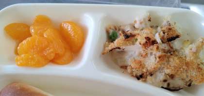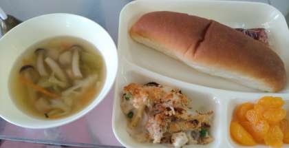 今日の給食は、マカロニグラタン、キャベツのスープ、みかん(缶)、コッペパン、いちごジャム、牛乳です。
