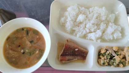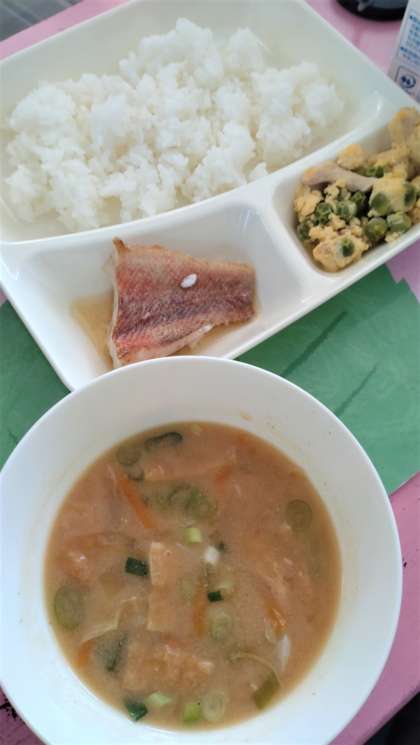 今日の給食は、あかうおのしょうゆだれかけ、みそ汁、えんどうの卵とじ、ごはん、牛乳です。