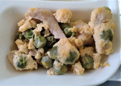 今日は、給食室でさやから取り出した生のえんどうを使っています。