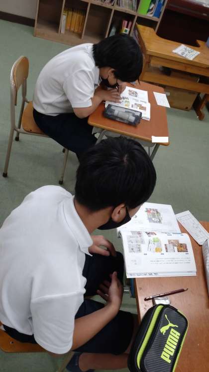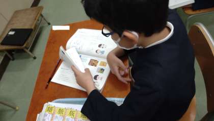 なかよし学級で国語の学習をしています。分類法や図書館に置かれている様々な種類の本や資料について学んでいます。