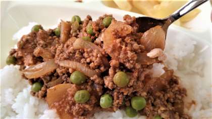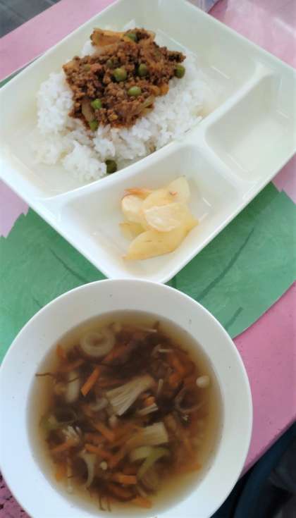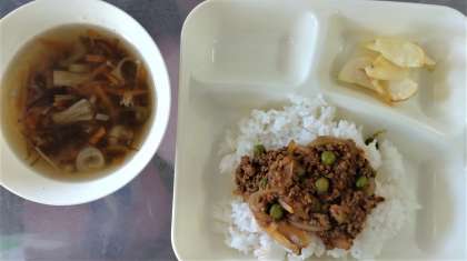給食では、牛ひき肉、豚ひき肉、たまねぎなどをいためて味つけし、ごはんにかけて食べます。