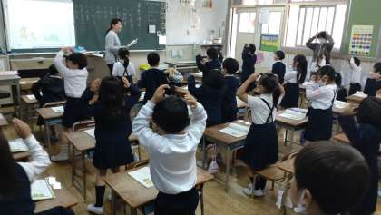 1年生の国語で単元「あめですよ」の学習をしました。絵と言葉を結び付けて、場面や人物の様子を思い浮かべ、語のまとまりや言葉の響きなどに気をつけながら音読しています。上の写真は、動作化したりみんなで読んだりして、音読を楽しんでいる子どもたちの様子です。
