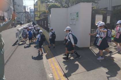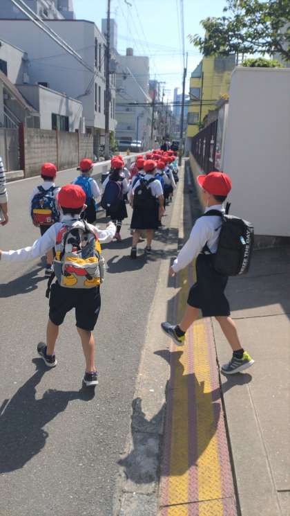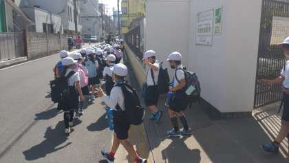 朝、1・2年生の子どもたちが元気よく、千里中央公園に向けて出発しました。今日は快晴で遠足日和となりました。