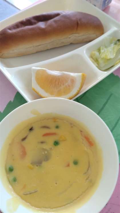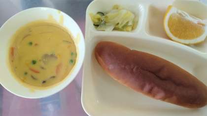 今日の給食は、コーンクリームシチュー、キャベツときゅうりのサラダ、かわちばんかん、黒糖パン、牛乳です。