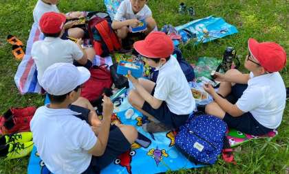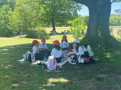 お弁当の時間です。きれいな芝生で、グループで楽しくお弁当を食べました。