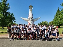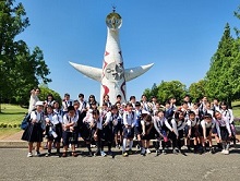 昨日の5年生の遠足の万博記念公園での青空の下での集合写真です。