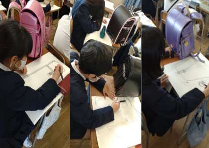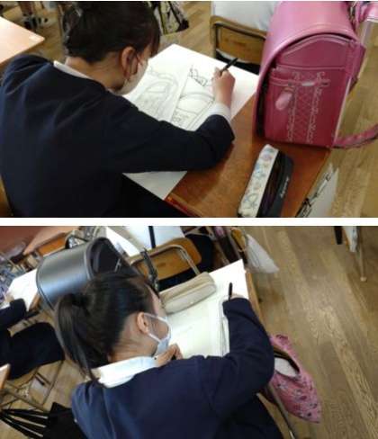 6年生が図画工作で描画に取り組んでいます。テーマは「いつも一緒にいた6年間」ということで、ランドセルを描画しています。マジックペンを使って、丁寧に模様や線を描いています。