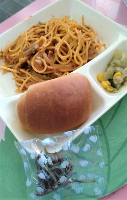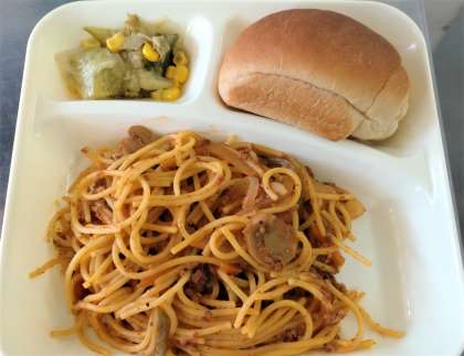 今日の給食は、ミートソーススパゲッティ、レタスとコーンのサラダ、ミニフィッシュ、黒糖パン1/2、牛乳でする。