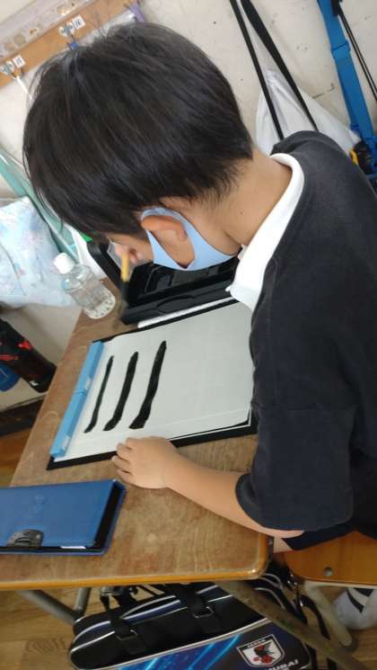 筆の使い方も少しずつ慣れてきました。写真は、筆や墨汁に慣れるための「線の練習」をしている子どもたちの様子です。